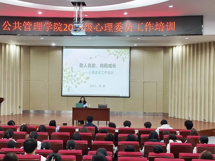 本网讯  近日,提升学院学生朋辈帮扶能力,助力学院心理健康教育工作有效开展,公管学院在图书馆二楼报告厅举办2025级新生心理委员及寝室长工作培训会,学院郑敏副教授担任主讲,学院全体2025级新生心理委员及寝室长参加本次培训。