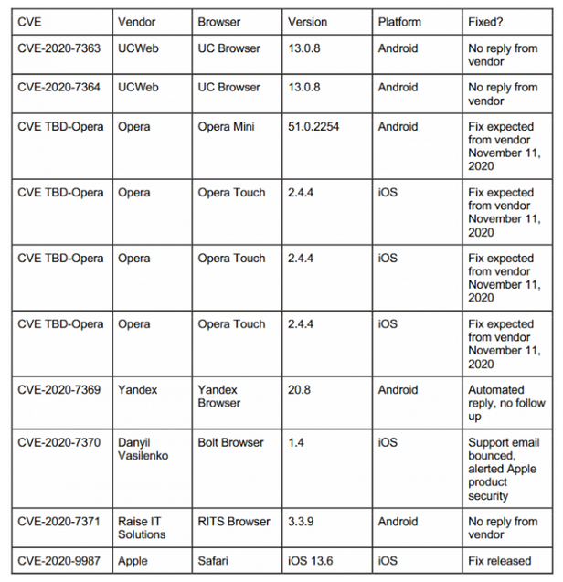 到目前为止,只有Apple和Yandex在9月和10月推出了修复程序。UC和Bolt Browser尚未修复,而Opera Mini预计将于2020年11月11日修复。