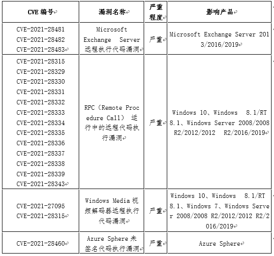 近日,微软发布2021年4月份安全补丁更新,共披露了108个安全漏洞,其中19个漏洞标记为严重漏洞。攻击者利用漏洞可实现远程代码执行、权限提升、敏感信息泄露等。受影响的应用包括:Microsoft Windows、Exchange Server、Office等组件。本月用户需关注如下重点漏洞:Microsoft Exchange Server远程代码执行漏洞(CVE-2021-28480、CVE-2021-28481、CVE-2021-28482、CVE-2021-28483)。攻击者将这四个漏洞结合利用可绕过Exchange身份验证机制,无需用户交互,实现远程代码执行。