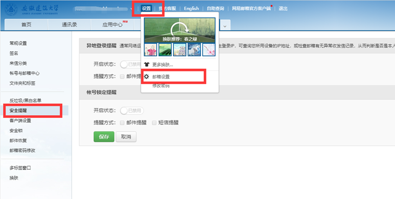近期有部分老师反映校园电子邮箱收到较多异地登录/账号锁定提醒邮件,其原因是电子邮件开通时为提高安全级别,系统默认开启了异地登录/账号锁定邮件提醒功能。由于近期互联网上的异常访问较多,为防止过多异常登录导致邮箱收到大量提醒而影响用户正常查看邮件,学校现已统一关闭异地登录提醒/账号锁定邮件提醒功能。如师生需要开通此功能,可以自行设置,设置方式为:设置->邮箱设置->安全提醒->点击“开启状态”旁边的按钮并设置为“已开启”状态->点击下方“保存”按钮。