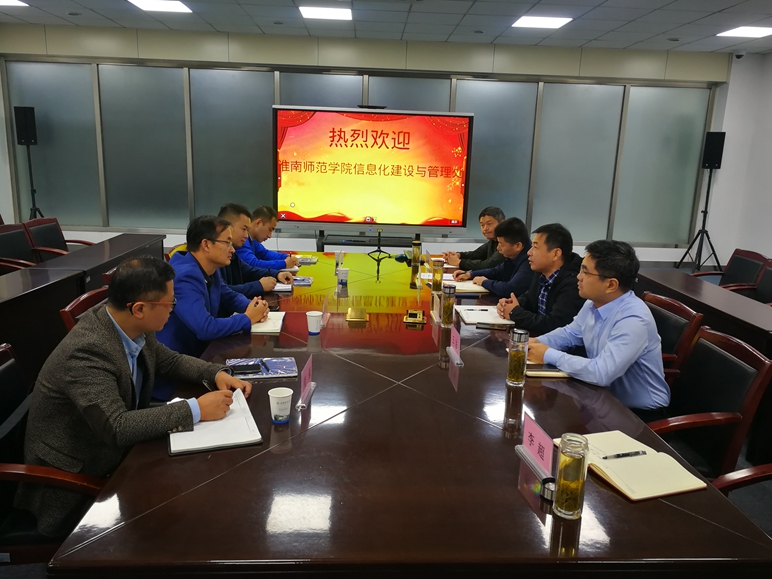 信网中心负责人对淮南师范学院同仁的来访表示热烈欢迎,并介绍了我校数据中心机房、南北校区无线网、网络安全、网上办事大厅、智慧教室以及各业务系统的建设情况,随后双方围绕信息化提升学校治理体系与治理能力现代化的理念开展深入交流。