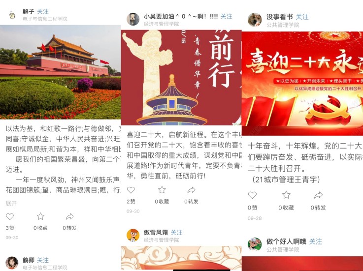 本次话题征集活动通过易班·今日校园线上平台开展,校易班发展中心开通话题“喜迎二十大,我爱你中国”,参加的学生带话题围绕主题于易班·今日校园大学圈发布参赛作品。在校学生积极报名,踊跃参与。学生用图片和文字相结合的方式表达自己对二十大召开的美好祝福,展现了当代青年学生昂扬向上的精神面貌。此次征集,共收集近200篇参赛作品,话题热度较高,受到建大学子的支持与喜爱。