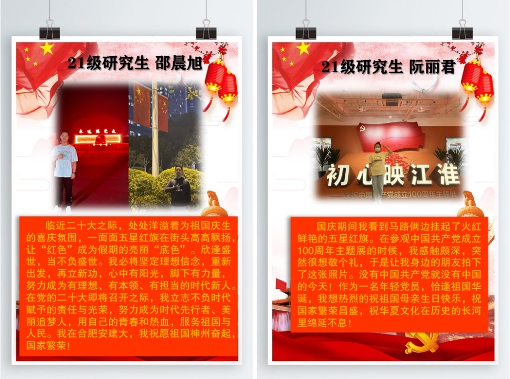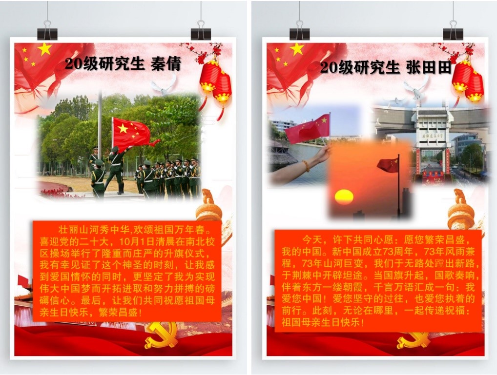 环能学院研究生党支部全体研究生党员积极报名,踊跃参与,他们用唯美的图片和动情的文字表达了自己对祖国的美好祝福,充分展现了当代研究生们爱党爱国情怀。此次征集,共收集了近80篇参赛作品,话题参与度高,得到了支部党员的充分支持。