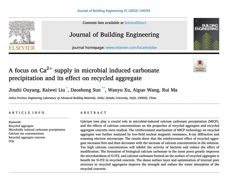 这是刘开伟副教授近年来在《Acta Geotechnica》(JCR Q1区,TOP期刊,影响因子5.736)和《Journal of Building Engineering》(JCR Q1区,影响因子7.144)发表生物碳酸钙在土木工程领域应用研究的高水平论文后的再次突破。