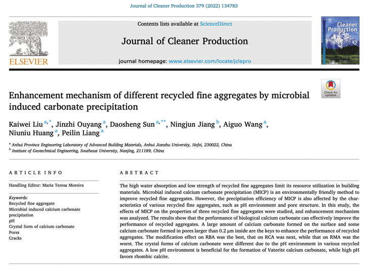 近日,我校先进土木工程材料科研团队孙道胜教授、刘开伟副教授指导硕士研究生欧阳金至在国际权威期刊《Journal of Cleaner Production》(JCR Q1区,TOP期刊,影响因子11.072)上发表题为“Enhancement mechanism of different recycled fine aggregates by microbial induced carbonate precipitation”的研究论文,标志着材化学院研究生培养质量的进一步显著提升。