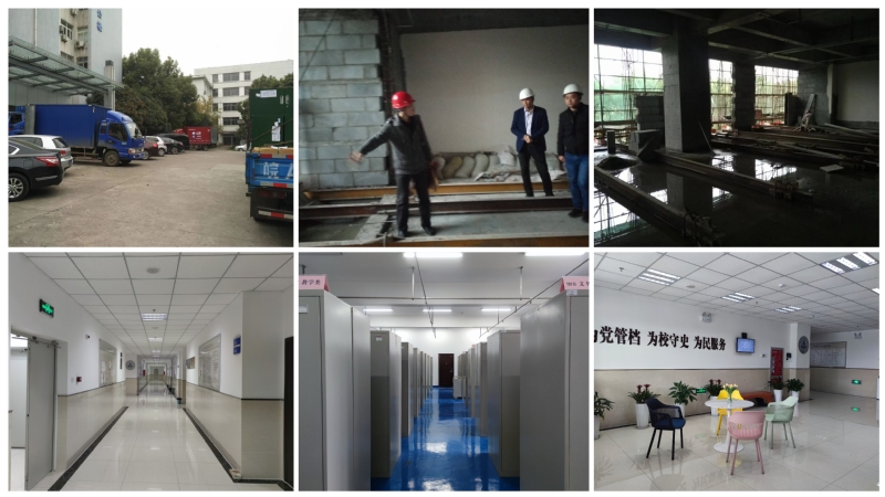 学校于1992年2月成立综合档案室,科级建制,隶属原学校办公室。此后二十年间,数次谋划建馆事宜,2017年1月学校适时建馆,原综合档案室及工作人员整体归并。建馆之初,馆址位于北区行政楼五层,总面积160㎡,其中库房面积约122㎡。新馆落成后,2017年11月安全稳妥完成整体搬迁,迁至南区实验综合楼二楼、三楼,面积约1100㎡,其中库房面积约750㎡。新馆严格执行“四分开”,办公用房、整理用房、阅览用房和档案库房等各类档案用房设置合理。建筑设计符合《档案馆建设标准》(建标103—2008)、《档案馆建筑设计规范》(JGJ25—2010)等标准规范要求。档案库房选用以高压细水雾为介质的灭火装置,安装全封闭防盗门窗、遮光阻燃窗帘、安防摄像头等防护设施,配备空调系统、除湿机、温湿度记录仪等监测调控设施设备。更新老旧档案装具,分批配备五节柜、财务凭证柜、实物柜、光盘柜、防磁柜、保密柜等237组。设置独立保密库房。确立档案馆徽标及文字标识设计,开展制度上墙、法律法规宣传、文化氛围营造,设置查档等候区,馆库内部及外围环境持续优化。