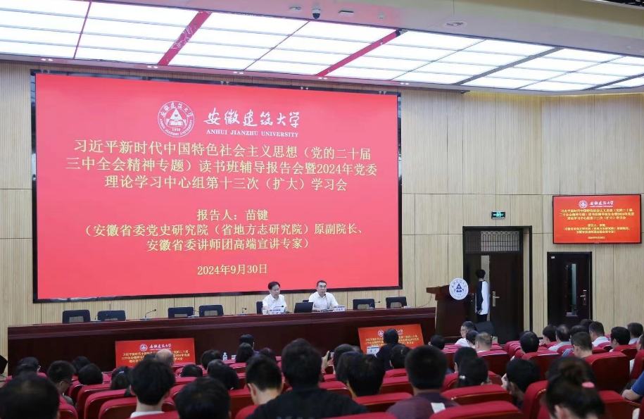 本网讯 根据学校2024年学习贯彻习近平新时代中国特色社会主义思想(党的二十届三中全会精神专题)读书班工作安排,9月30日上午,学校党委在紫云路校区徽韵楼二楼报告厅举办学习贯彻习近平新时代中国特色社会主义思想专题辅导报告暨党委理论学中心组第十三次(扩大)学习会。