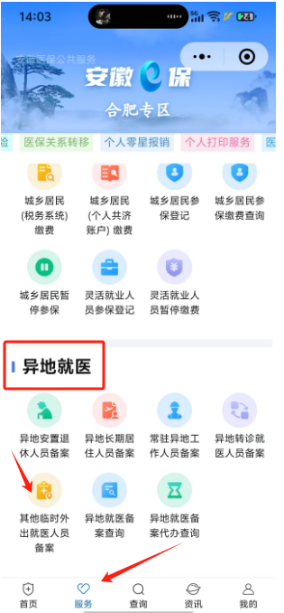 4.进入服务页,找到异地就医模块,进入“其他临时外出人员就医人员备案”