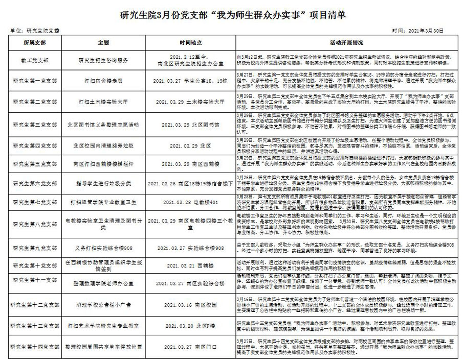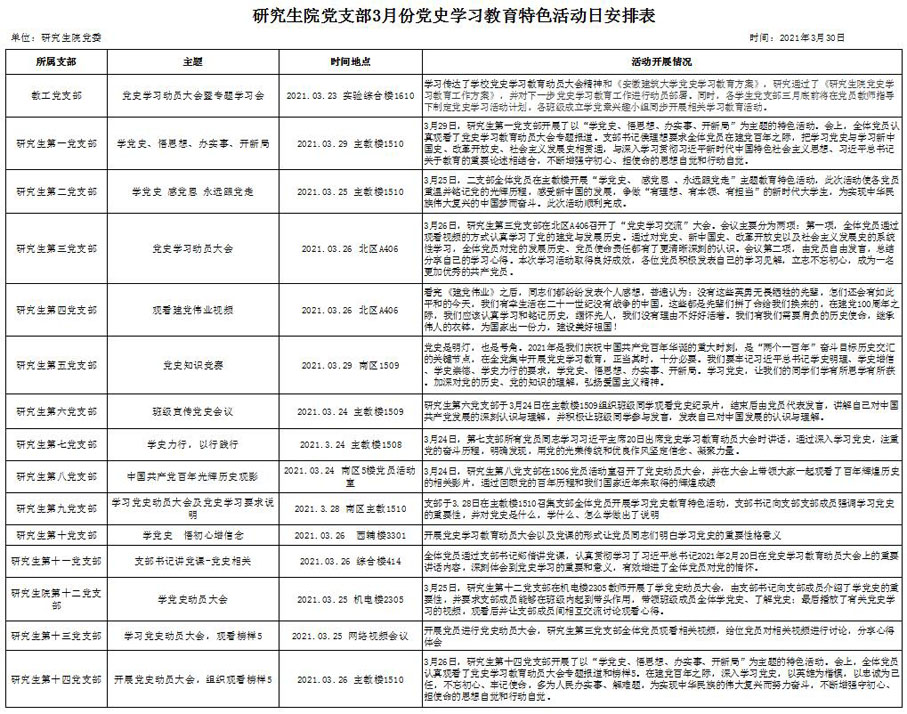 在三月的主题活动中,各研究生党支部结合支部实际和特点,发挥积极性、主动性、创造性,制定并开展各具特色的党史学习教育实践和党员活动,活动内容既突出党员带头示范、师生乐于参与,又突出研究生群体特点、贴近学生需求。(文/图:孙晓庄、贺一凡,审稿:徐庚阳)。