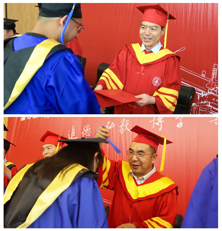 黄显怀、蔡国军、参会领导和导师为毕业研究生扶正流苏。