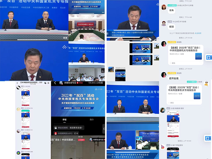 本网讯 2022年“百名法学家百场报告会”法治宣讲活动中央和国家机关专场报告会在北京举行。为深入学习宣传和贯彻落实习近平法治思想,推进中国特色社会主义法治体系建设,7月22日,艺术学院党委组织党员干部准时上线收看报告会。