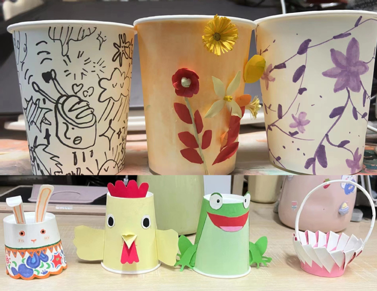同学们充分发挥想象力与创造力,“指墨点画”,用指纹根据提示在纸张上创造出独属于自己可以收藏的浪漫,将独特的自我和一种浪漫的艺术表达方式完美融合。同学们用巧手妙构“纸杯随心变”,打造具有个人风格的小小艺术品,将创意与专业能力碰撞的火花投射于双手之上,展现出属于青年人独有的美学思想。