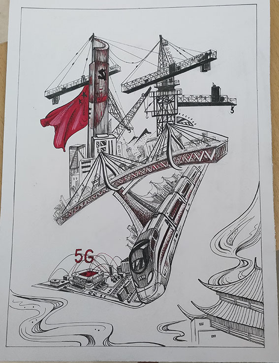 22公共艺术的马雯雯同学运用漫画的形式,从“抗击疫情”、“脱贫攻坚”、“5G速度”等视角,描绘了党和国家事业取得的历史性成就,展现了中华民族自信自强、守正创新,踔厉奋发、勇毅前行的精神品质。