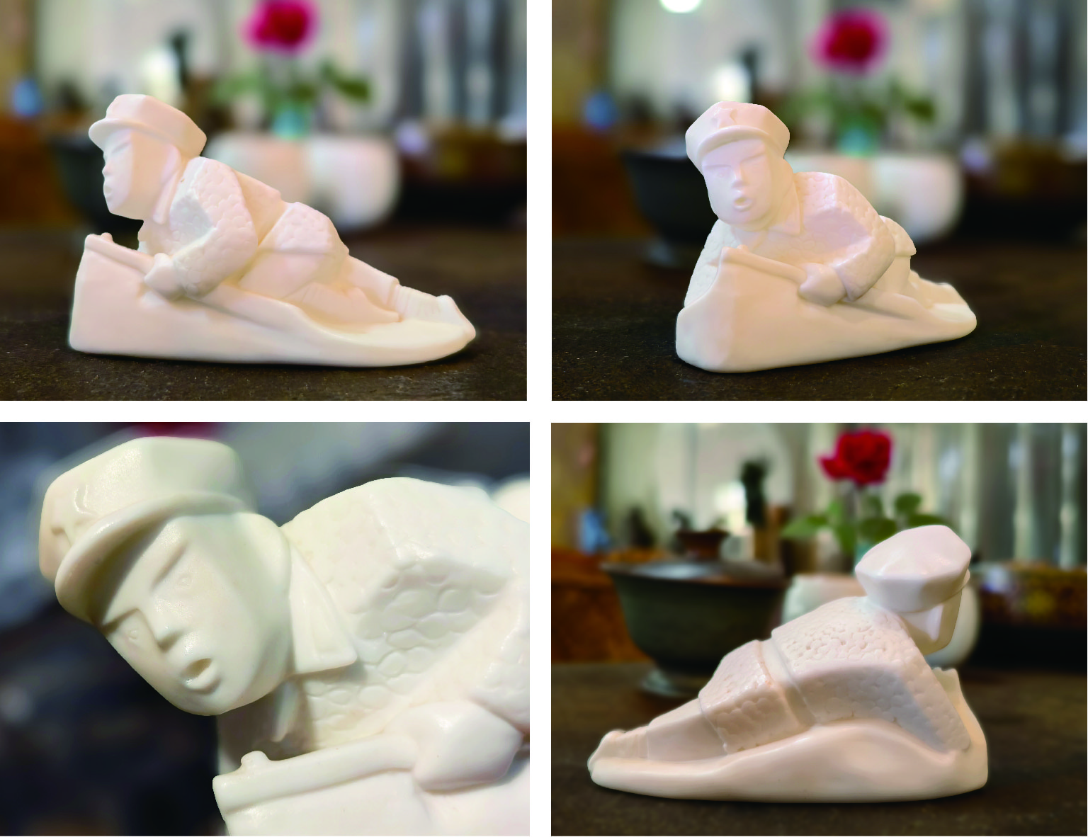 同学们通过雕刻与烧制,用细腻的手工赋予泥土蓬勃的生命力和独特的艺术价值。《白瓷红影小战士》是一款白瓷茶器作品,以红军战士形象为主体,用细腻的白瓷精心雕琢,作品质地温润,色泽纯净。红军战士头戴八角帽,身姿挺拔,眼神坚定而充满希望,仿佛能听到历史的回声,提醒着我们珍惜当下,铭记历史,传承红色基因。