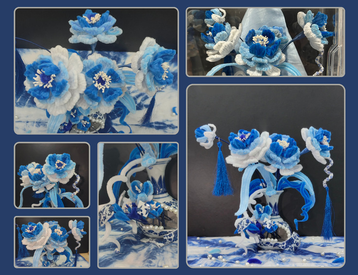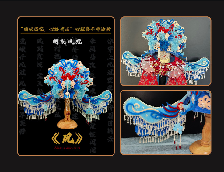 作品明制凤冠通过红、白、蓝三种主色调的精妙配合,融合了扭扭棒、布料等多种材料,成功呈现了明代凤冠的华丽与典雅。不仅展现了学生中华民族优秀传统文化的理解和感悟,也反映了他们在创作中进行自我认同与情感释放的过程。每一次细致的构建、每一个细节的雕琢,都是对艺术与情感的深度共鸣。