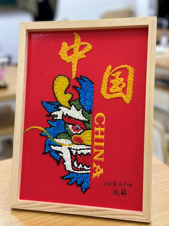 同学们以五谷为媒,以中华文化为核心主题,运用龙、熊猫、和平鸽等典型形象,展现民族精神与文化内涵。龙的形象象征中华民族深厚的文化底蕴与生生不息的奋斗精神;火箭升空、宇航员飞天的设计,展现了中国在航天科技领域的飞速发展与民族自立自强的时代精神。作品整体以劳动、收获和希望为核心意象,通过构图、色彩与寓意的巧妙融合,表达了同学们对文化传承的责任感以及对国家未来发展的坚定信心。