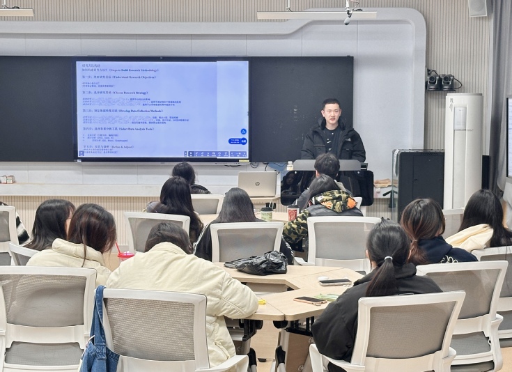 本网讯 为深化环境设计(中外合作)项目的国际化人才培养体系建设,依托优秀毕业生开展朋辈示范教育,助力在读学生科学规划留学路径,3月12日下午,艺术学院举办了主题为“探索与选择—与UCL学长对话”的留学经验分享会。本次活动邀请了2016级环境设计(中外合作)项目毕业生陈乾元校友进行经验分享,中外合作办学项目协调员雷媛老师主持活动,40多名学生参加分享会。
