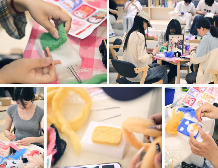 活动以布织布拼贴、毛毡塑形、戳戳绣创作等三种艺术形式为载体,引导同学们在纤维艺术的经纬间编织心灵暖阳,在针尖起落中解锁情绪纾解的艺术密码。学生社团古法新韵工艺坊指导老师介绍了手工疗愈的原理与技巧,鼓励同学们或独立或组队自由创作表达情绪、放松身心。每一次布料剪裁都是情绪的形象化表达,每一针戳刺都是与内心的深度对话。在布织布拼贴工坊,通过裁剪、拼接色彩明快的布料,将零散的素材转化为充满故事感的画面;在毛毡塑形空间,以柔软的羊毛毡为媒介,戳制萌趣玩偶或抽象造型,体验触觉带来的治愈感;在戳戳绣创作区,用特制针笔在绣布上“描绘”图案,发出“沙沙”声响,如同情绪的具象化体现。