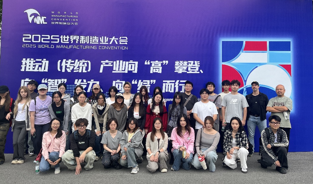 本网讯 9月22日下午,艺术学院空间设计系组织环境设计(中外合作)毕业班学生赴2025世界制造业大会开展研学活动,空间设计系教师代表及外籍教师共同参与。