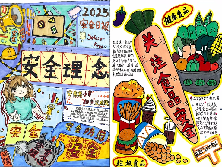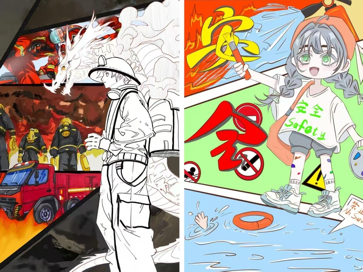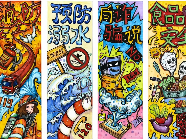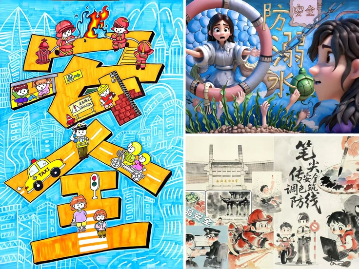 活动作品涵盖消防安全、食品安全、防溺水、防诈骗等多个主题,表现形式多样,创意突出。有的运用漫画分镜,将消防场景与科普元素结合,生动传递安全知识;有的通过手绘艺术字,将安全标识与生活场景融合,直观呈现“安全无小事”的理念;有的设计系列竖幅作品,分别聚焦不同安全主题,色彩鲜明、警示性强;还有作品采用立体造型或水墨手法,增强视觉冲击力的同时,体现了传统文化与现代安全的交融。