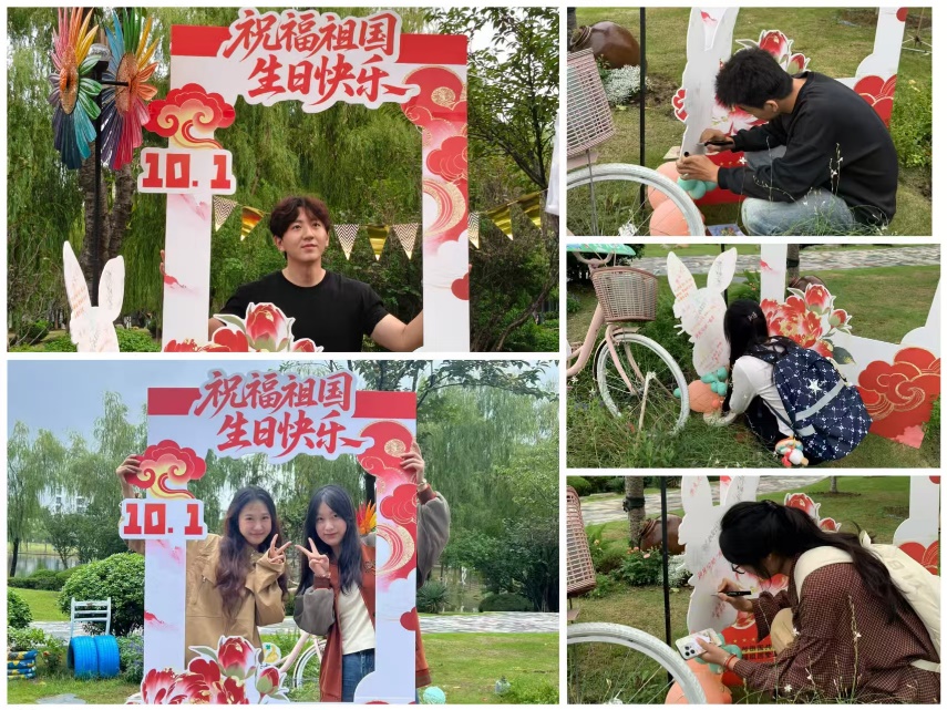 除抽奖环节外,活动现场还设置两大互动区域,增强参与体验。“庆祝祖国生日”主题相框合影墙,同学们纷纷驻足拍照,以笑脸定格对祖国的祝福;兔形签名板,大家提笔写下双节心愿与家国寄语,字里行间满是真挚情感。