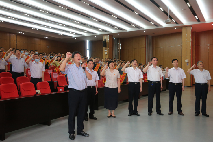 大会在雄壮的《国歌》声中拉开序幕,校党委书记方潜生带领全体党员重温入党誓词。