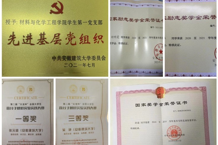党支部不断加强党员的教育引导,切实提高党员自身综合素养,发挥示范引领作用。支部党员在学业、考研、就业方面取得了良好成绩,2018年吴妮同学荣获美国大学生数学建模比赛二等奖、校十佳大学生,2019年、2020年王金路、许婕获得校“优秀共产党员”荣誉称号,2021年余洁获得校十佳大学生,党支部荣获校先进基层党组织荣誉称号,2021年张元盛、吴艳同学在第二届全国大学生高分子材料实验实践大赛中分别获得一等奖、三等奖。