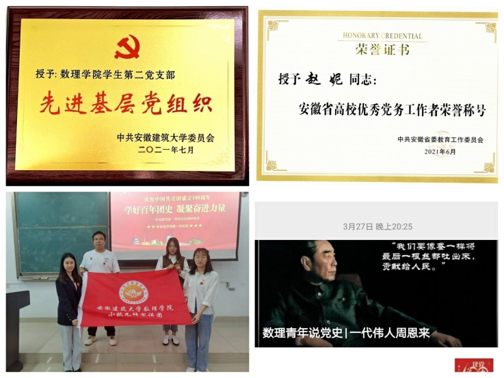 学院党委加强党员队伍建设,打造干事创业先锋模范,在教学科研、服务师生、服务社会等方面发挥着先锋模范作用,支部战斗堡垒作用逐步彰显。一是率先垂范立标杆。疫情期间,教师党员李璐深入研究线上教学,建立完善《线性代数》网络课程体系,获得安徽省“线上教学名师”、“卓越教坛新秀”、校“优秀共产党员”荣誉称号;积极参加教学比赛,先后获得《高等数学》教学创新比赛国家级二等奖,省级特等奖等。近年来,刘华勇等6名教师党员获得安徽省数学建模优秀教师,严飞等10名教师党员获得省级“教坛新秀”。学生党员潘应浩专业知识扎实、创新创业能力强,先后获得“2019年度安徽省大学生年度人物”、安徽省“优秀大学生”、安徽省“创新创业好青年提名奖”和“勤学上进好青年提名奖”等荣誉称号。二是挂牌上岗亮身份。学生党支部在班级、宿舍中建立“党员示范岗”“党员之家”,挂牌上岗,亮出身份,以身作则,接受监督。把工作责任落实到每栋宿舍、每个楼层,把服务面扩大到广大学生当中,在岗位上树立党员良好形象,在师生中展现党员先锋模范作用。三是服务师生勇争先。组织教师党员下沉学生当中,开展考研、考博、学业、就业、创新创业辅导;学生党员争当“朋辈导师”,发挥“传、帮、带”作用,与学业困难学生手拉手,成为学习“合伙人”,定期在专业学习、创新创业、文化体育等方面开展“一对一”学业帮扶;师生党员积极投身志愿服务活动,在毕业生离校、新生报到、高考网评、疫情防控等社会服务工作中展现榜样风采。