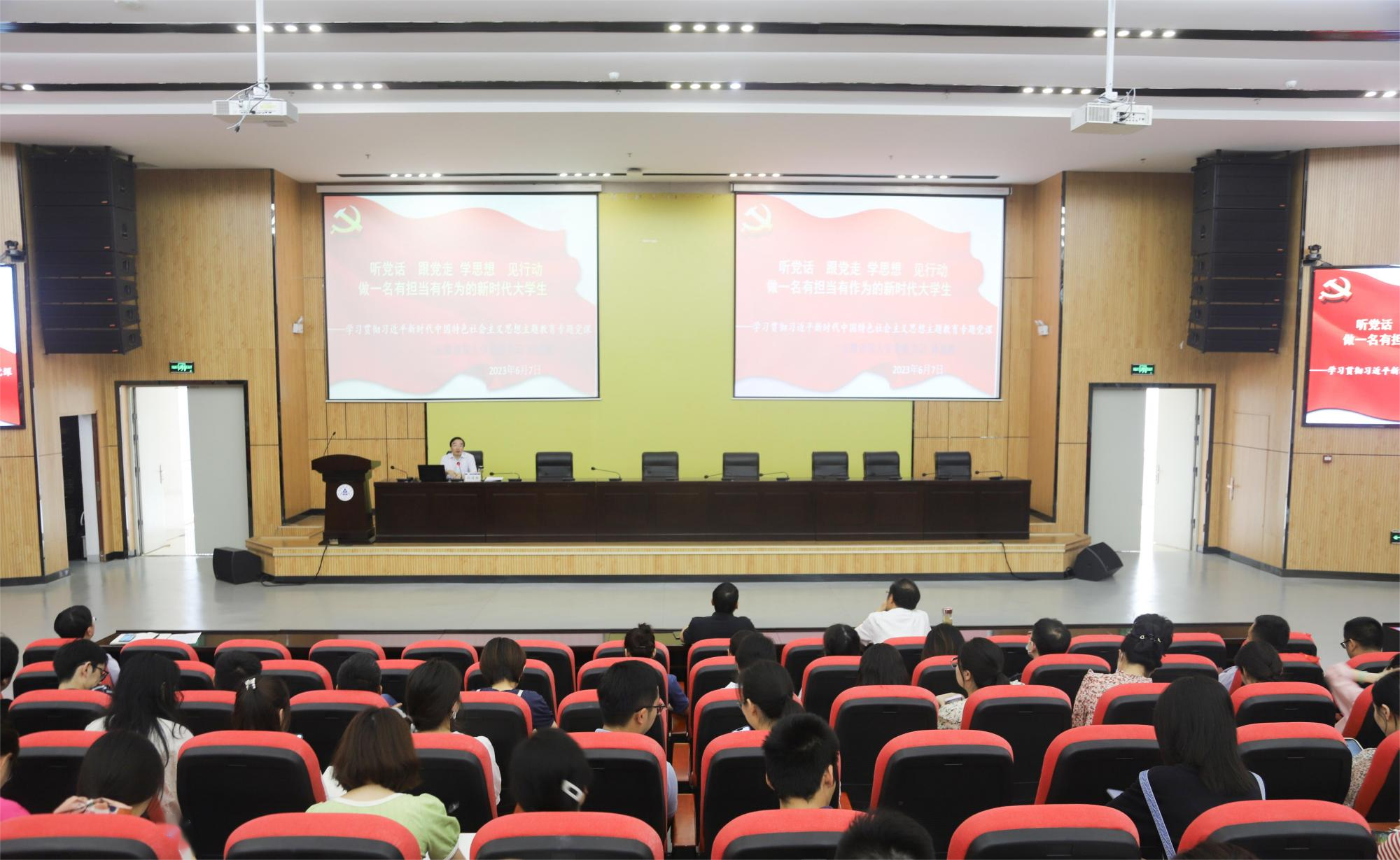 本网讯  6月7日下午,学校学习贯彻习近平新时代中国特色社会主义思想主题教育专题党课在南校区实验综合楼二楼报告厅举行。校党委书记孙道胜以“听党话、跟党走、学思想、见行动,做一名有担当有作为的新时代大学生”为题作专题党课报告,学校2023年第二期党员发展对象、机关第一党委党员干部、马克思主义学院教师360余人参加党课报告会。
