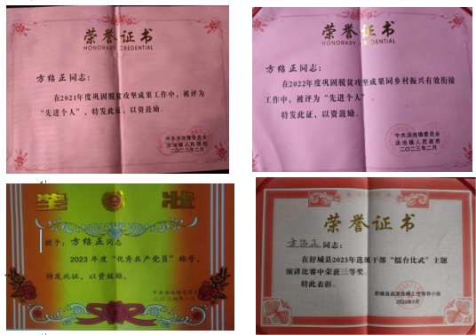 方绍正带领工作队积极参与人居环境整治、“两癌”筛查、防返贫监测、防诈骗宣传、防溺水、防震减灾宣传等活动。利用“板凳会议”和入户走访,深入群众宣讲党的二十大精神、“十项暖民心行动”、殡葬改革、秋收秋种、耕地恢复等工作。2023年春天,按照舒城县殡葬改革要求,方绍正带领工作队与村“两委”及时召开村民代表大会,通过登门谈心等方式做好政策解读。2022年汤池村获得第六届六安市文明村镇称号;2023年汤池村获得舒城县“民主法治示范村”、六安市明星村称号。