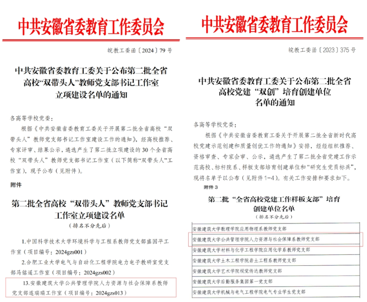 本网讯  2022年10月,学校党委遴选8个“双带头人”教师党支部书记工作室培育创建单位,公共管理学院人力资源与社会保障系(以下简称“人社系”)教师党支部连瑞瑞工作室获批立项建设;2024年2月,党支部被遴选为第二批全省高校“双带头人”教师党支部书记工作室立项建设单位。在学校及学院党委坚强领导下,人社系教师党支部扎实推进“双带头人”书记工作室培育建设,坚持“七个有力”,发挥“两个作用”,扎实推进党建工作和教育教学深度融合发展。通过创新实施“1-2-3-3-3”工作法,深化理论研究,创新活动载体,着力打造“红色管理”党建品牌,培育建设取得积极成效,人社系教师党支部获批省级新时代党建双创“样板支部”培育创建单位。