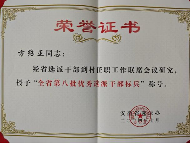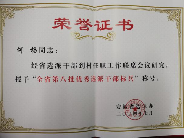本网讯  近日,安徽省选派干部到村任职工作联席会议通报了450名第八批优秀选派干部标兵名单。我校选派干部方绍正、何杨两位同志荣获“全省第八批优秀选派干部标兵”称号。