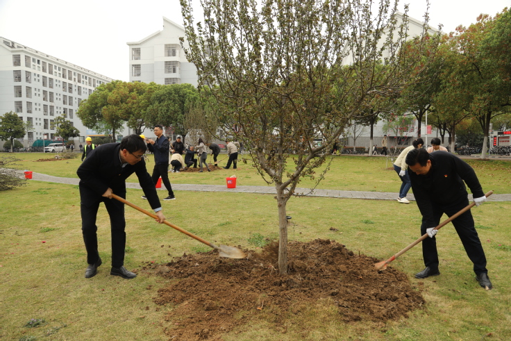 植树现场,党员们分工协作,挥锹铲土、扶苗填坑、培土浇水,干劲十足。经过大家的辛勤劳作,栽种的10棵海棠树在校园里安家落户,每一棵树苗不仅寄托着大家对绿色校园的美好期望,也为校园增添了一抹新绿。